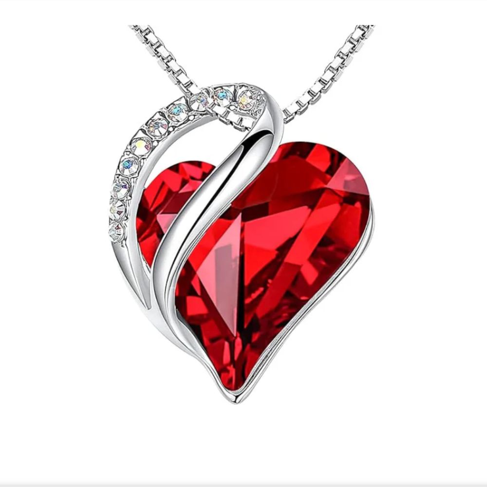 A large heart-shaped red stone is cradled in a flowing silver-toned infinity setting, accented with sparkling clear stones along the curve. The Estelle Infinity Heart pendant hangs from a delicate box chain and catches the light beautifully at the neckline.
