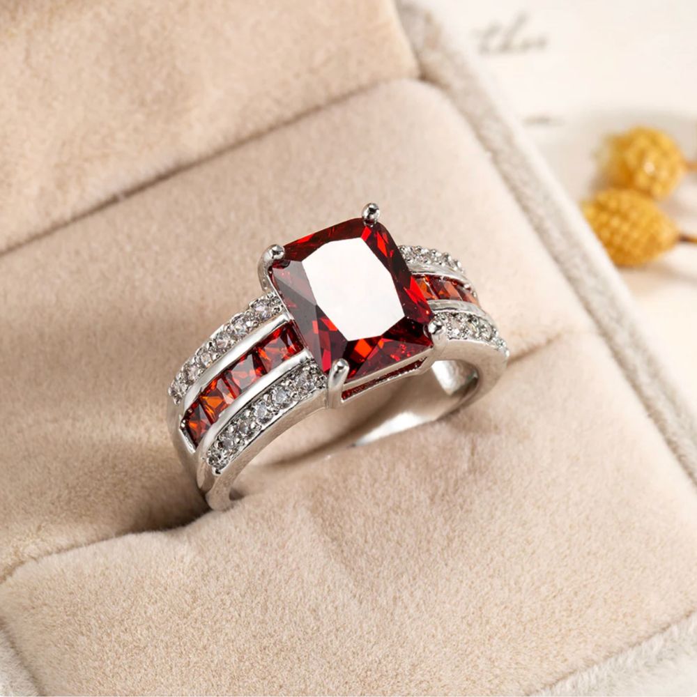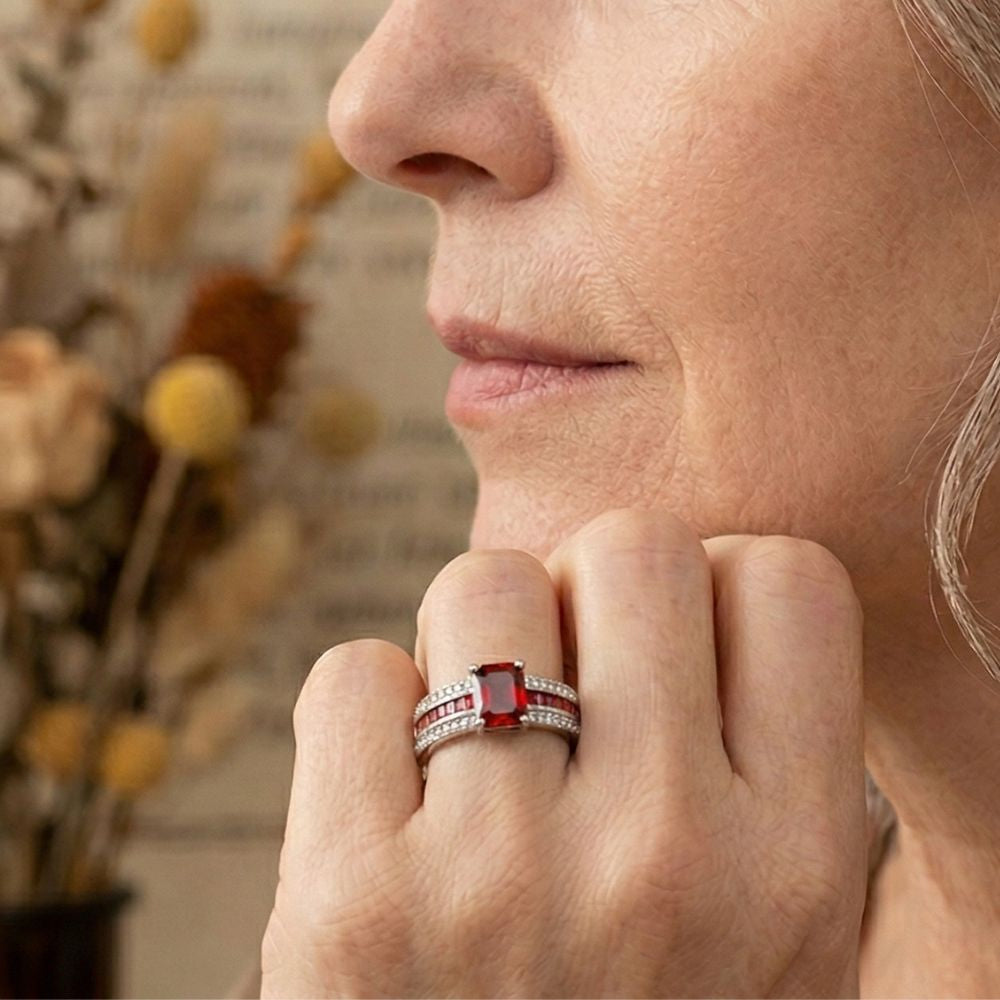 The Kassira Redmont from Estelle features a bold rectangular-cut red stone set high on a silver-toned band, flanked by rows of channel-set red accents and sparkling pavé detailing. It catches the light from every angle.