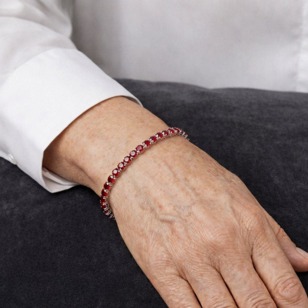 A continuous line of round-cut red stones, each individually set in polished silver-toned prongs. The Estelle Ruby Tennis Bracelet sits close to the wrist with a secure clasp closure and just enough sparkle to catch every glance.